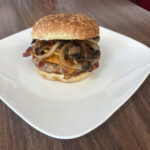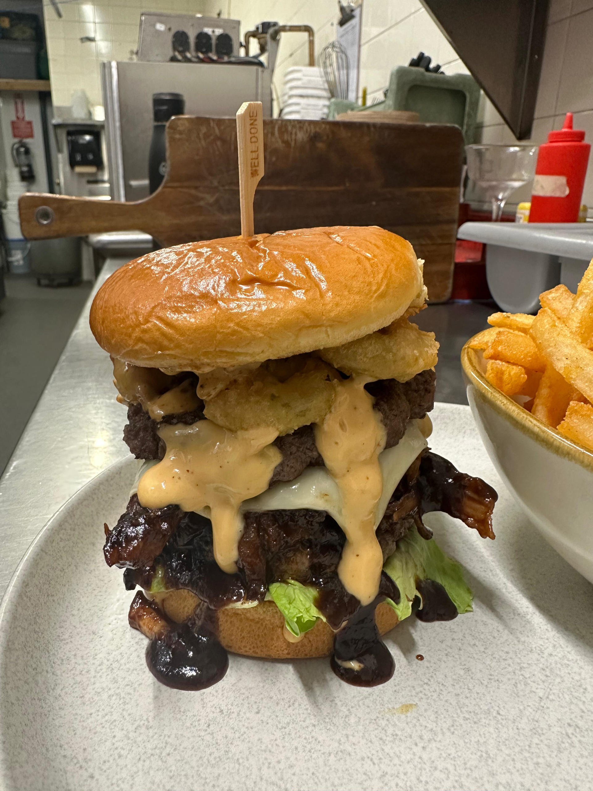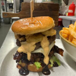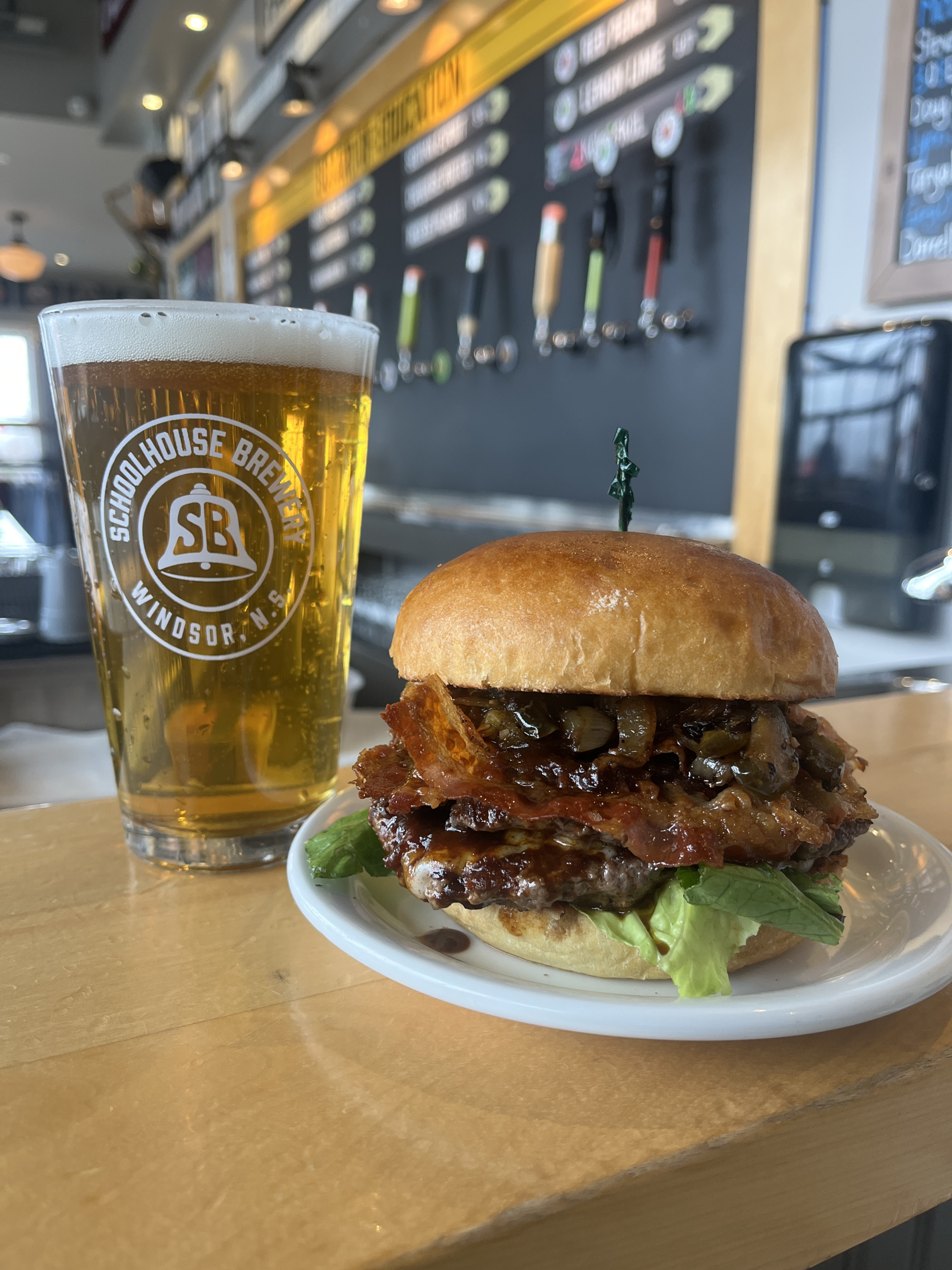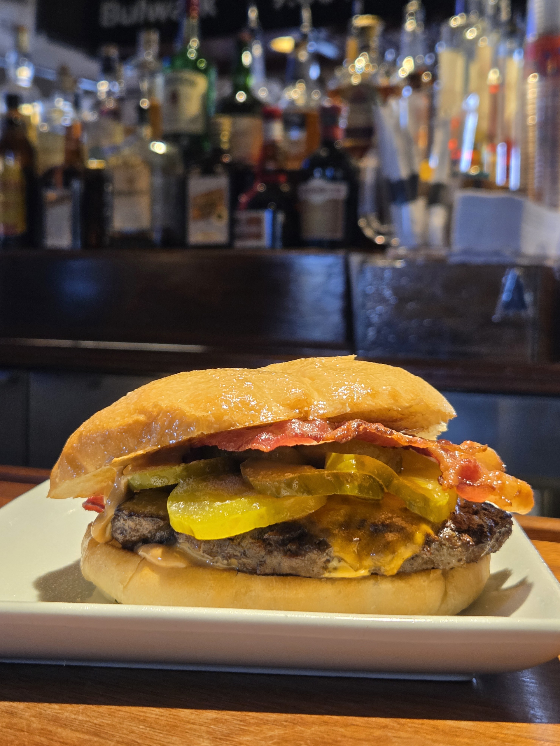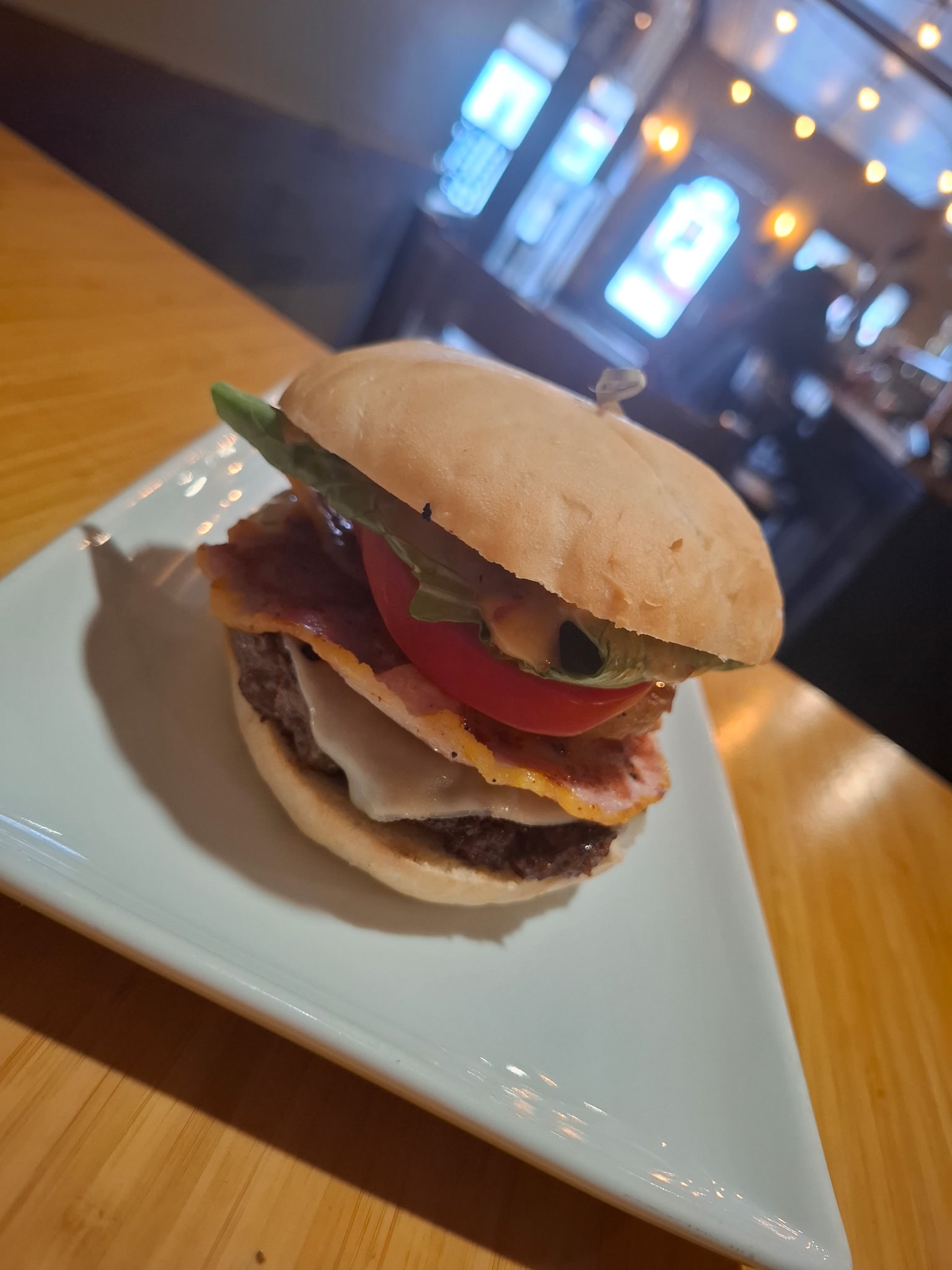 ![]() | ![]() | Double patty, topped with bacon sauteed onion and Jalapeno, Porter BBQ sauce, Lettuce, and Mozzarella cheese. $22 with a side of fries Gluten Free Option | Windsor |