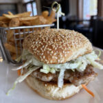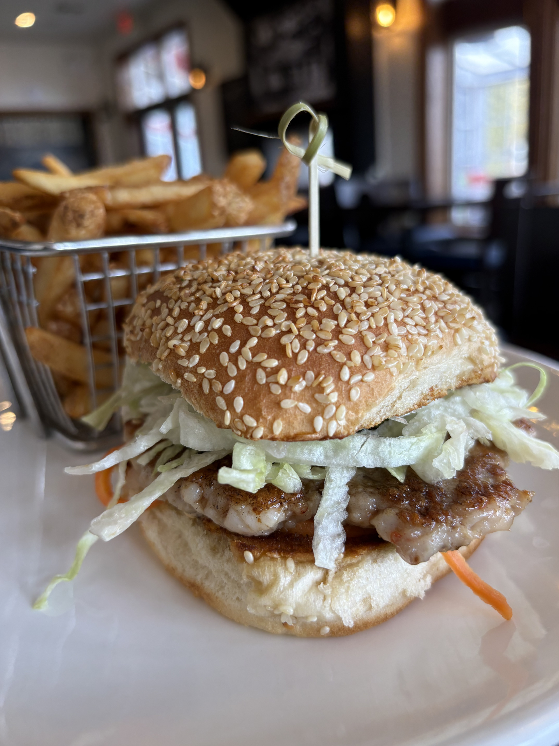 ![]() | ![]() | Pork and shrimp patty, hoisin sauce, sriracha aioli, pickled carrots and daikon, cilantro, butter lettuce on a sesame bun, with fries or house salad. $20.95 Vegetarian and Gluten Free Option | Port Williams |