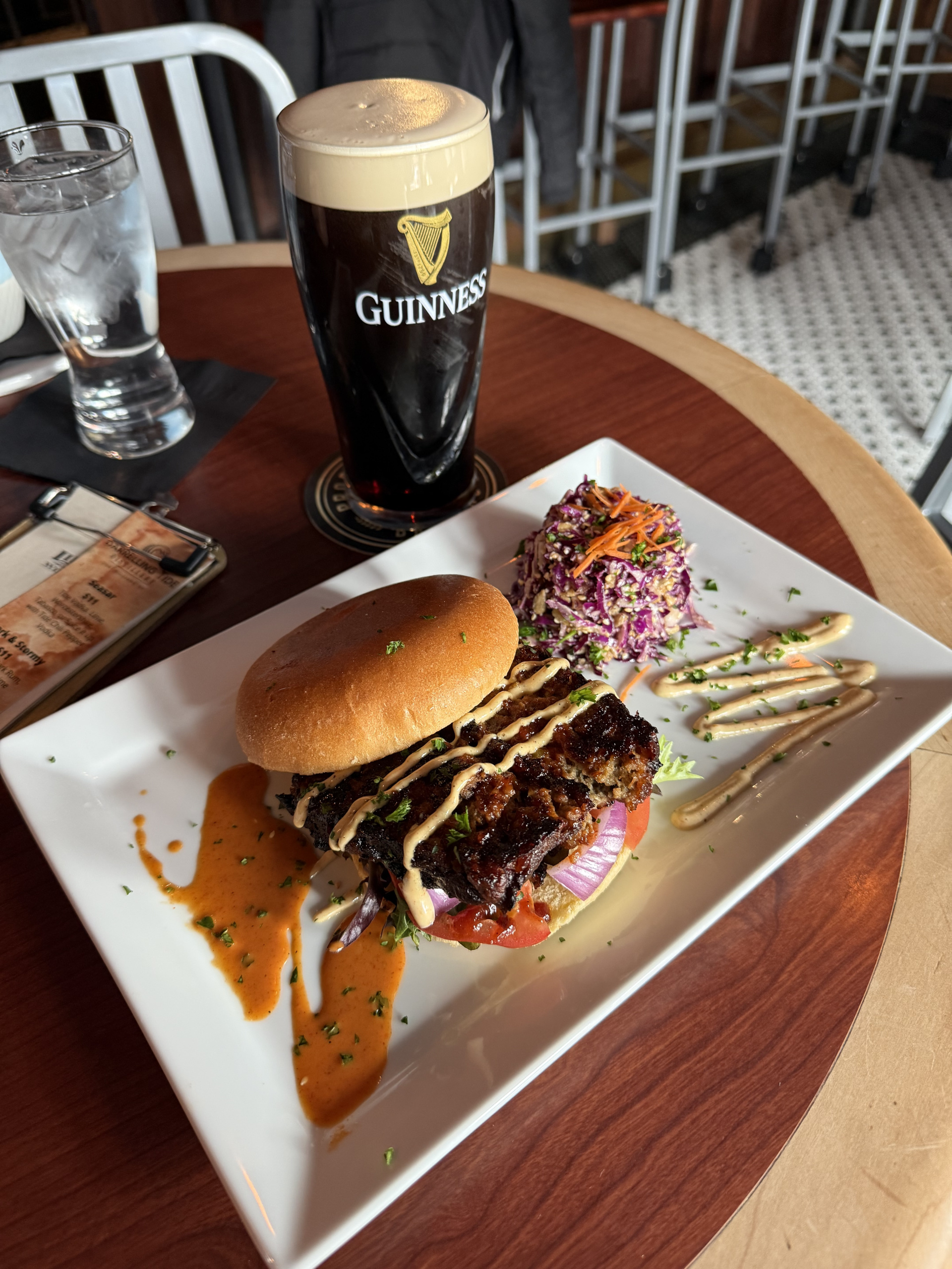 ![]() | ![]() | Guinness marinated breaded chicken breast with spinach, tomato, Swiss and goat cheese topped with house made burg burg sauce, Guinness glaze and pickled vegetables(carrot, red onion and jalapenos) on a brioche bun. $19 Gluten Free Option | New Minas |