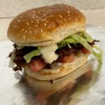 ![]() | ![]() | Homemade bun with bbq sauce, burger patty, mozzarella cheese, bacon, mozzarella sticks drizzled with choice of ranch dressing or chipotle sauce and topped with an onion ring | Coldbrook |