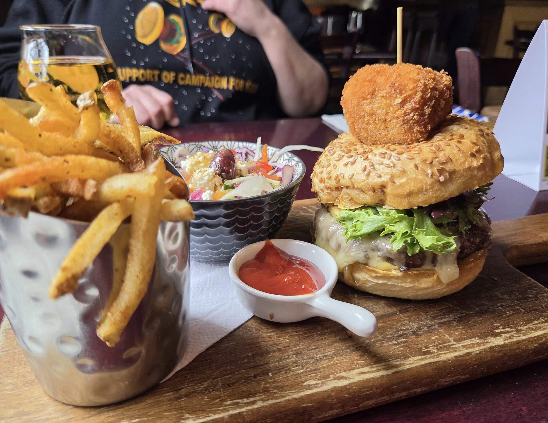 ![]() | ![]() | Sweet potato jalapeno bun, panko onion ring, cheese sauce, bacon, red onion, pickled jalapeno, lettuce, power sauce, and 2 smash patties! $23 Gluten Free Option | Wolfville |