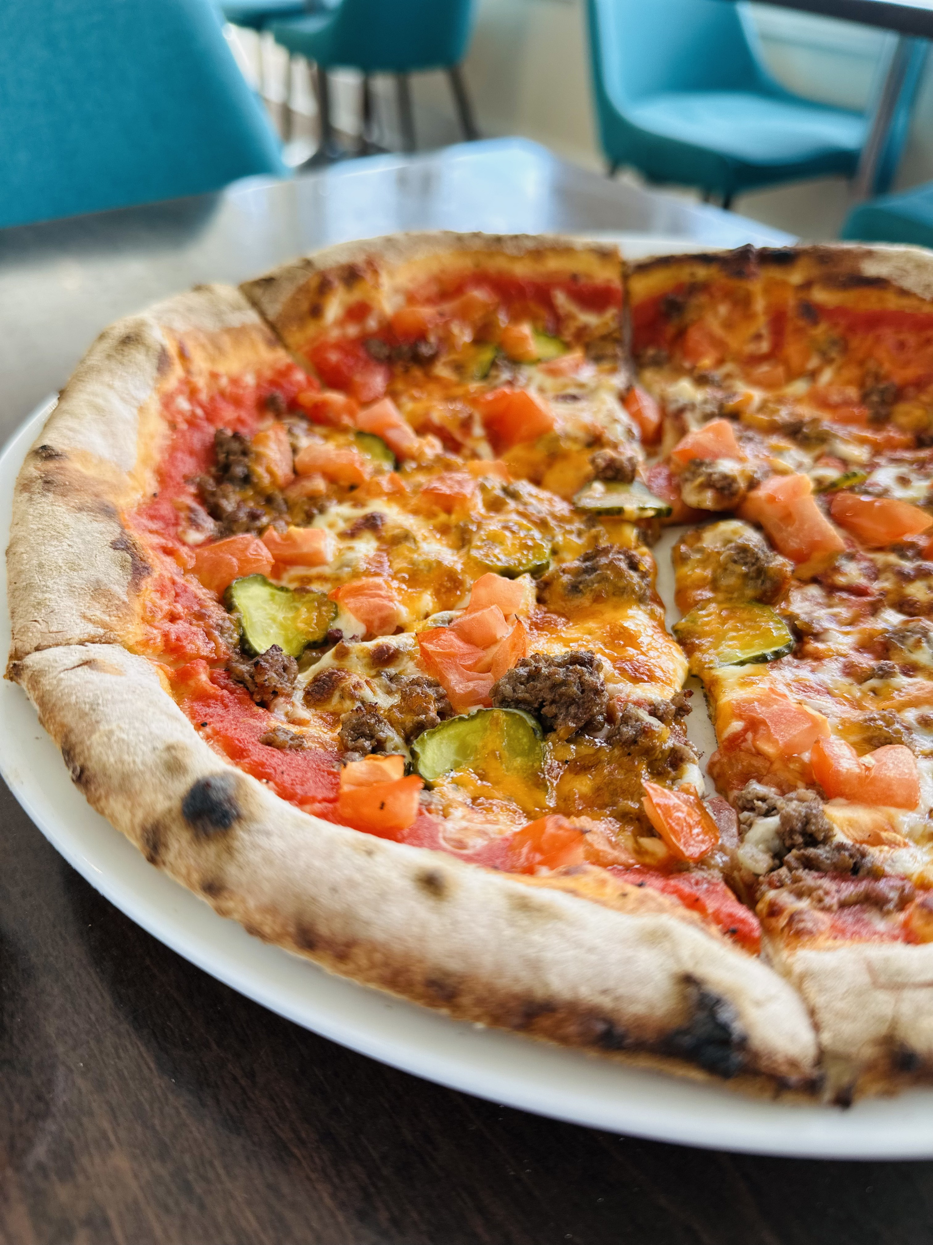 ![]() | ![]() | San Marzano tomato sauce, mozzarella cheese, seasoned ground beef, crispy maple bacon, cheddar cheese, topped with fresh lettuce, tomato, pickles, green onion, sesame seeds and a secret house-made maple sauce! 9" $18, 12" $27, 19" Gluten free $27 Gluten Free Option | Windsor |