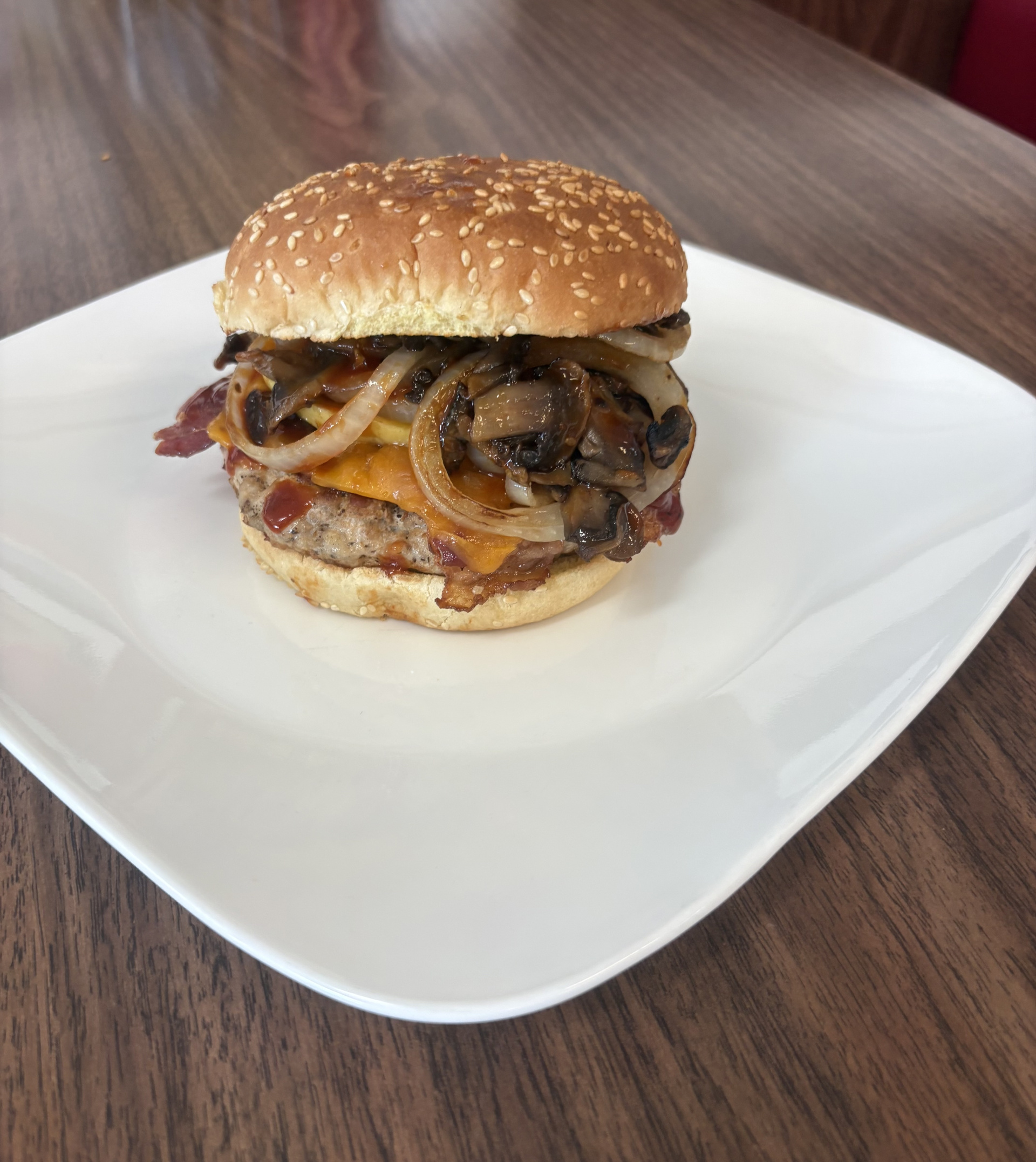 ![]() | ![]() | A juicy bacon-blended beef patty topped with a crispy homemade mozzarella patty, dipped in bold Nashville hot sauce for the perfect kick. Finished with fresh lettuce, crunchy pickles, sliced onions, and creamy ranch sauce, all stacked together for the ultimate balance of heat, crunch, and flavor. One bite and you’ll know why this burger is a contender. $17.99 or $14.99 with no side | Windsor |