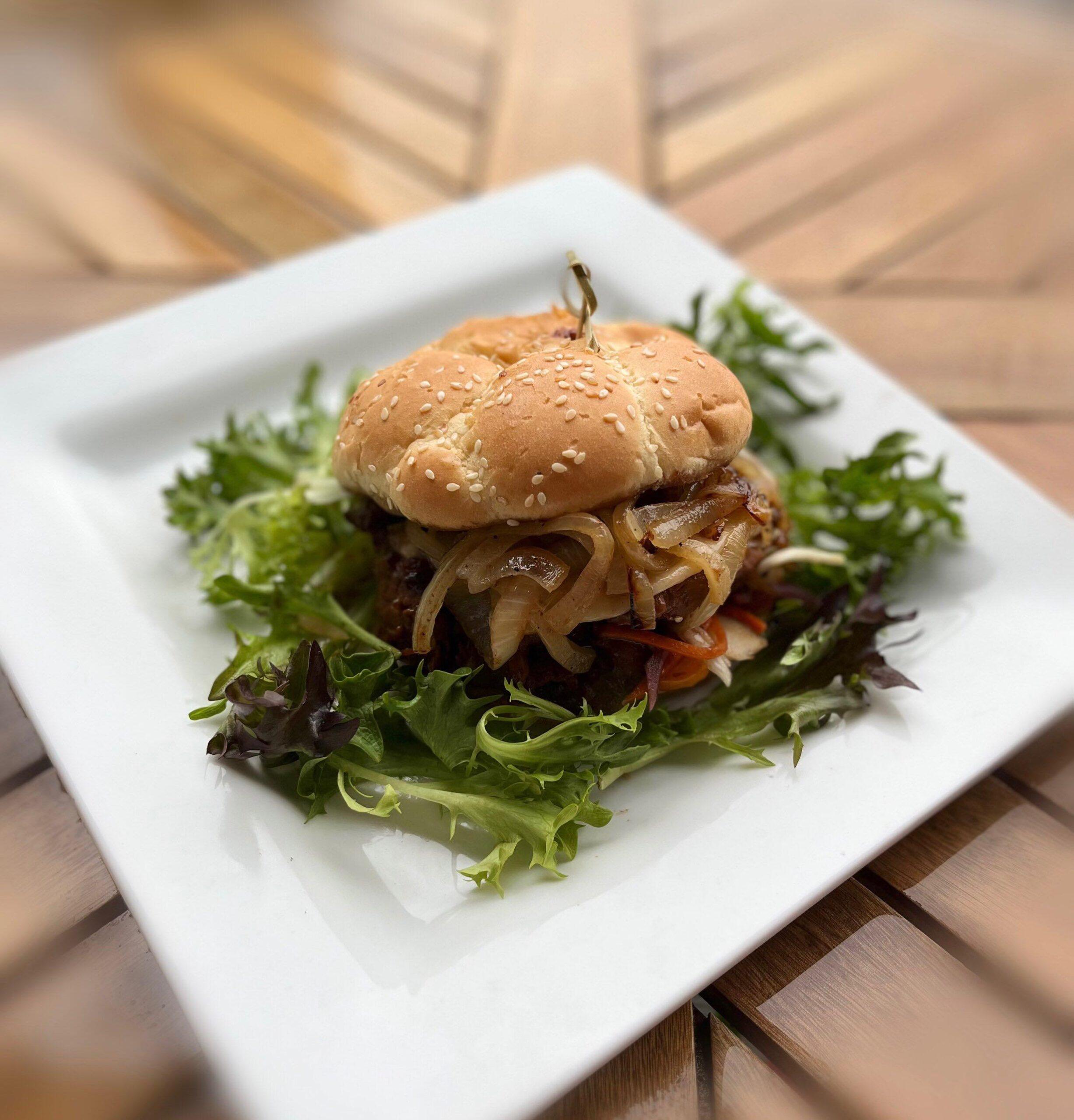 | Our burger takes inspiration from lumpia, the beloved Filipino spring roll. Each bite delivers a perfect balance of crunch and savoury goodness, with a filling infused with classic Filipino flavours like garlic, onions, carrots, celery and a hint of soy with crisp lettuce and drizzled with a creamy, tangy sweet chili mayo. Topped with a rich, velvety homemade cheese sauce and a crispy, golden spring roll wrapper for an irresistible crunch. Served on a toasted brioche bun. Vegetarian option GF option $16.99 | Eat In Take Out | Hants Border | ||